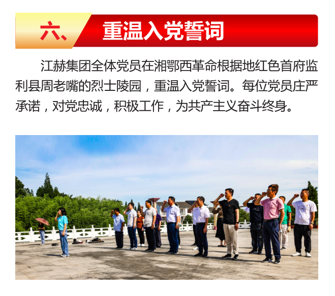 在中国共产党建党100周年之际,为大力发扬红色传统,传承红色基因,争做时代新人。在江赫集团党支部书记、董事长王忠孝同志的带领下,江赫集团党员走进著名的湘鄂西革命根据地红色首府和洪湖瞿家湾参观学习。