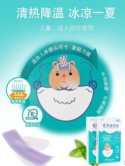 物理降温是高热患者除药物治疗外,最简易、有效、安全的降温方法。医用退热贴还由于其具有挥发性,可吸收并带走大量的热量,使体温下降、症状缓解。大人小孩都可使用。